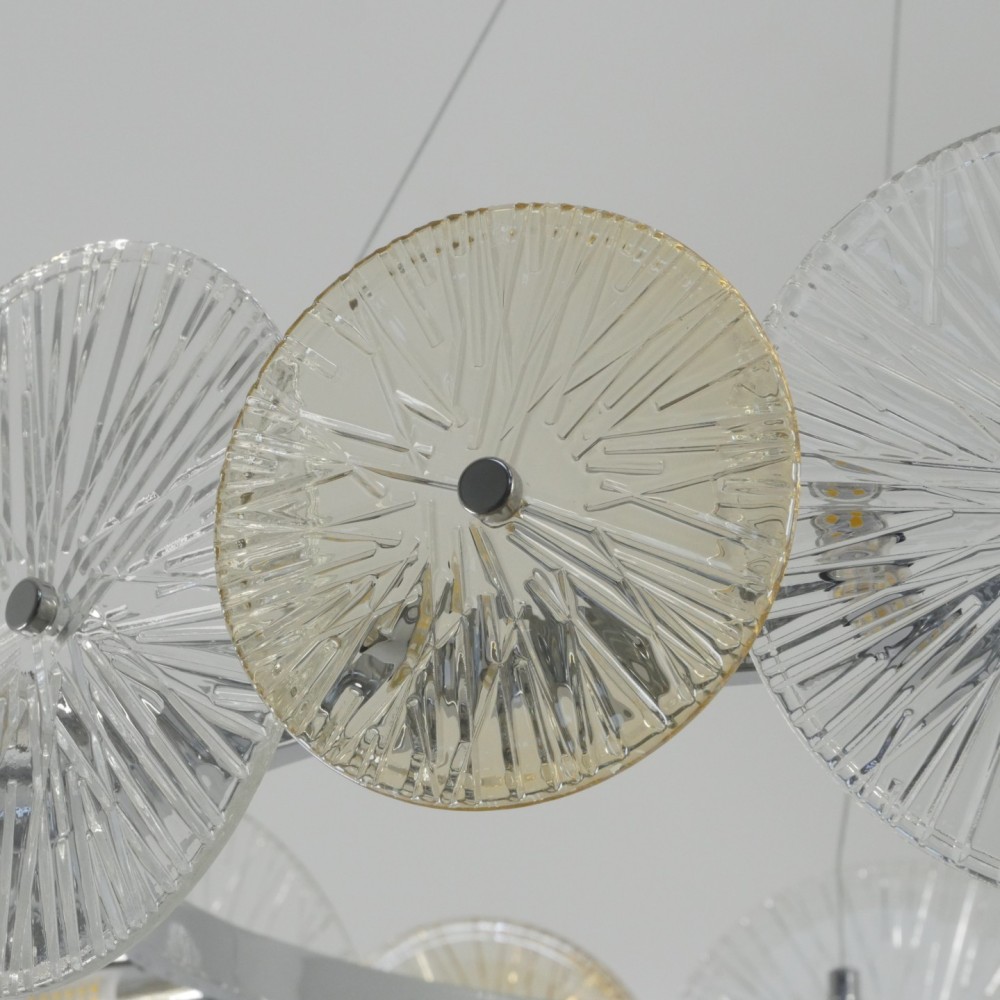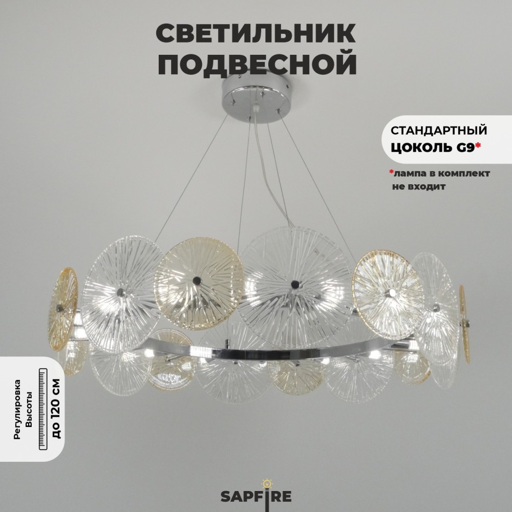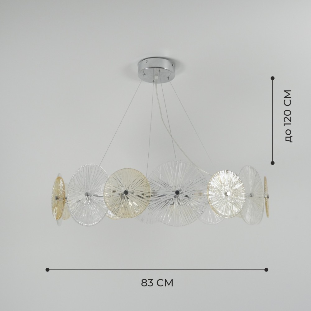 Потолочная люстра DAISY – изящное осветительное устройство с нежным флористическим дизайном. Хромированный металлический каркас напоминает изысканный венок, состоящий из множества цветов различных оттенков. По окружности располагается красивый прозрачный декор из стекла. Лучи света проникают сквозь 2 рифленых стеклянных диска разного диаметра. Роскошная стеклянная люстра создана высотой 1200, диаметром – 830 мм. Источники освещения – 16 галогеновых ламп мощностью до 40 W, с типом патрона – G9 Аналог:Люстра подвесная St luce SL1657.203.10Modelux Подвесная люстра ModeSTYLE MS.1831.12Подвесная люстра Maytoni AsterЛюстра Лас Светас 83008/6Подвесной светильник Indigo Miele 12021/7PПОДВЕСНАЯ ЛЮСТРА 9088 D500Люстра подвесная St luce FLEROПОДВЕСНАЯ ЛЮСТРА MAYTONI MOD007PL-10Подвесной светильник Vele Luce Sirena VL3203P08