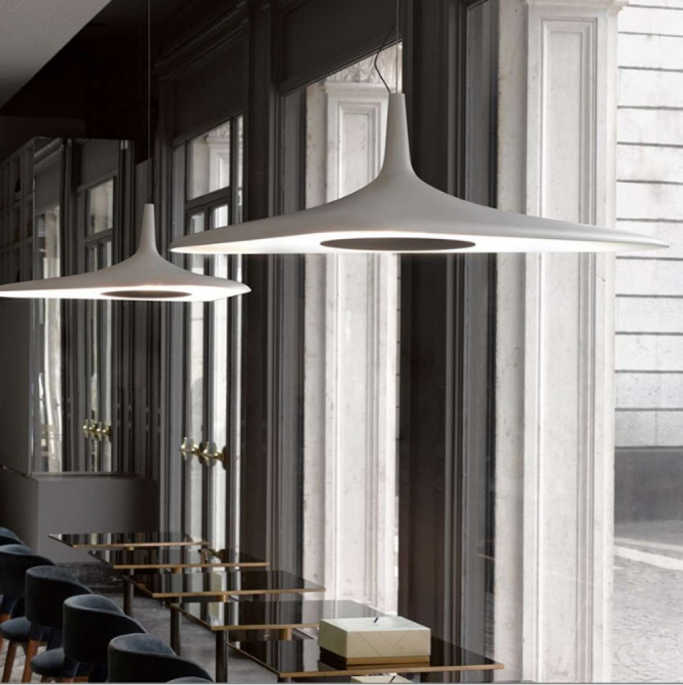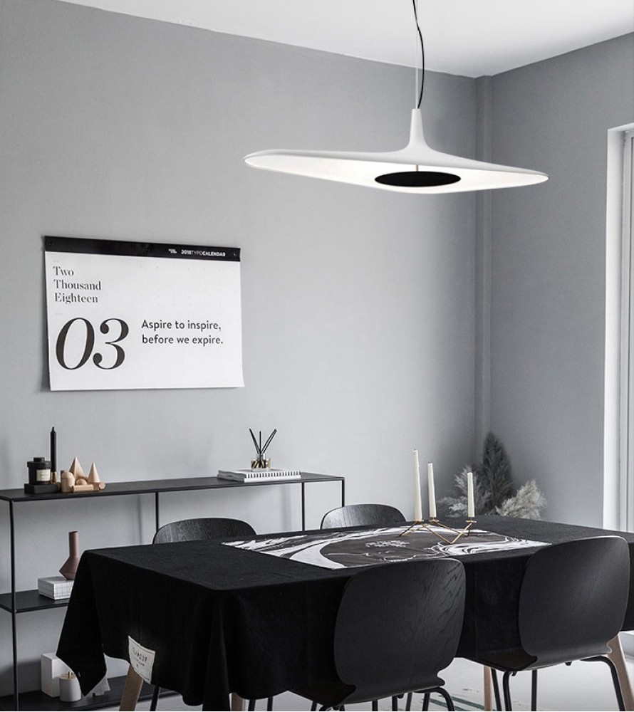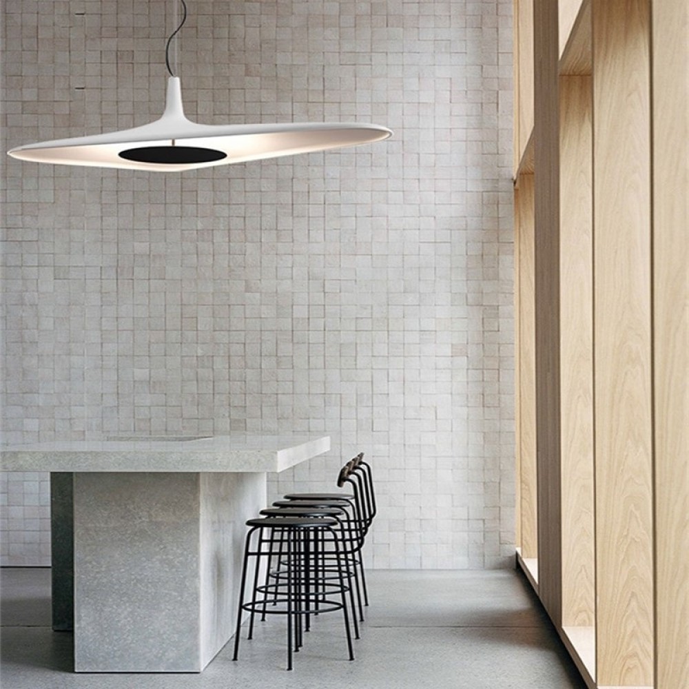 Футуристичный подвесной светильник серии FLOSEA от ELEGANT LIGHT (Элегант лайт) с необычным световым экраном треугольно-овальной формы. ⠀Креативный дизайн с черным круглым диском в центре.