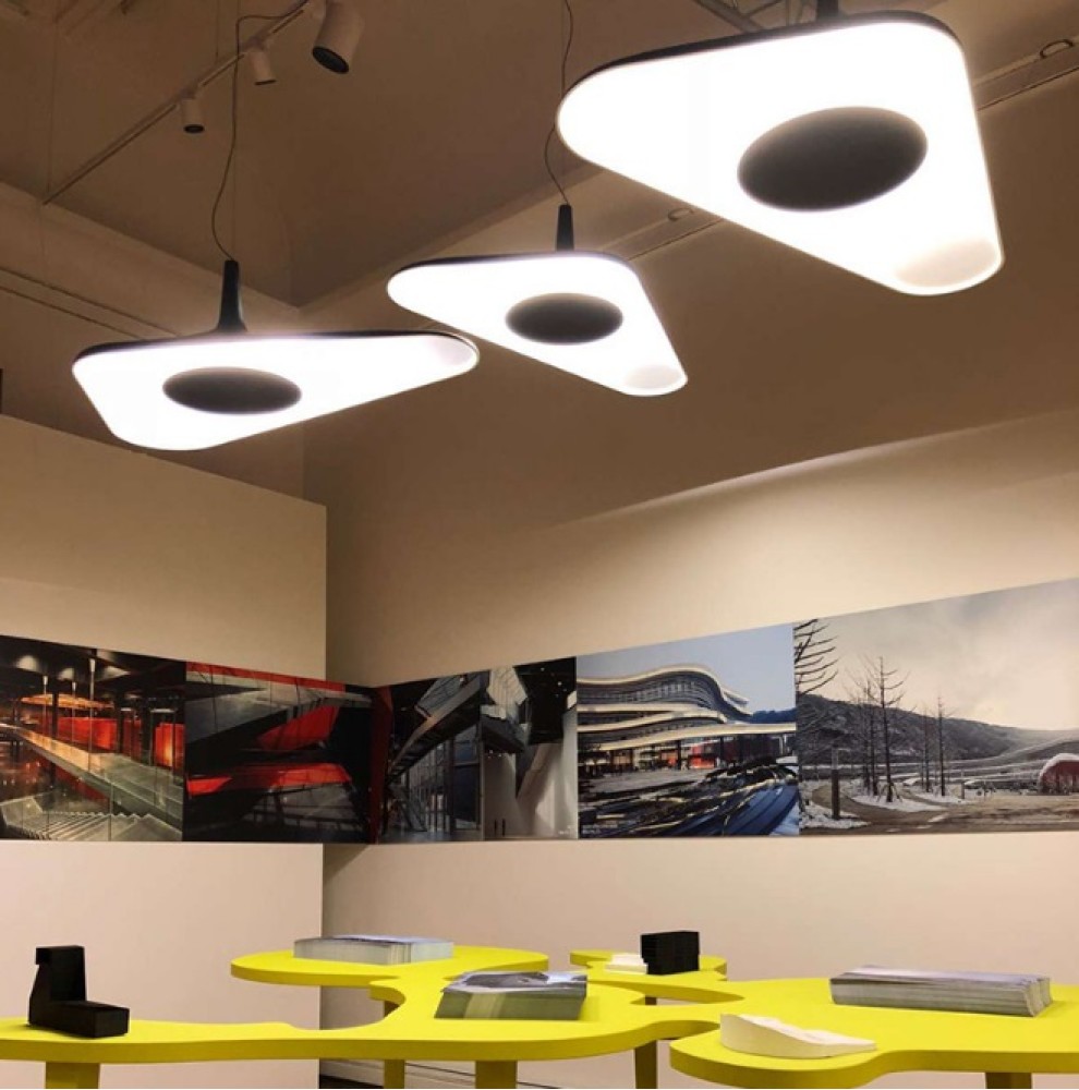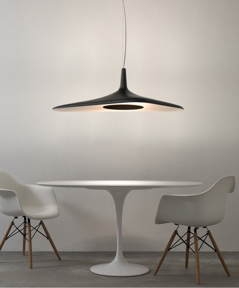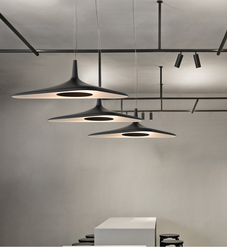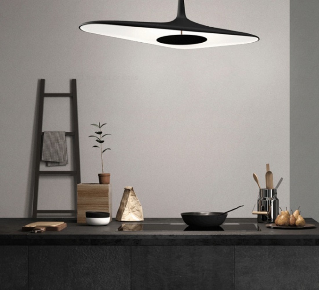 Футуристичный подвесной светильник серии FLOSEA от ELEGANT LIGHT (Элегант лайт) с необычным световым экраном треугольно-овальной формы. ⠀Креативный дизайн с черным круглым диском в центре.